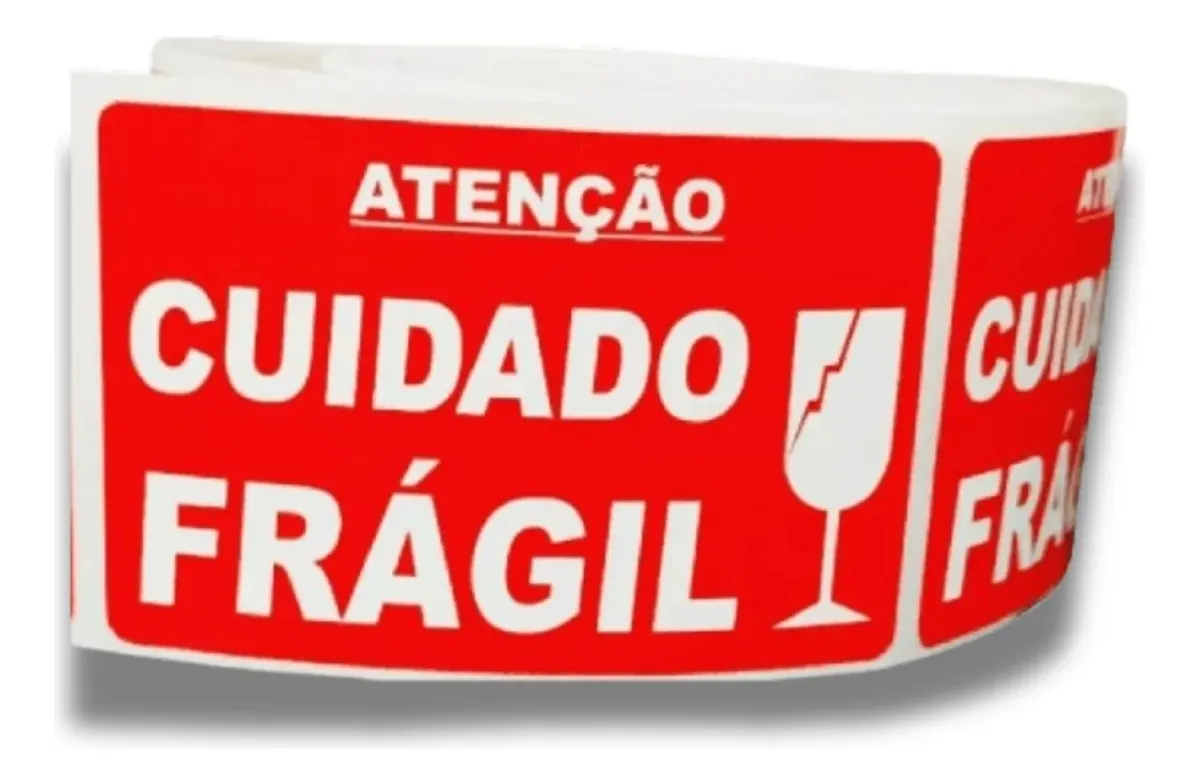 Etiqueta adesiva Frágil na cor vermelha, que se destaca por sua alta qualidade e durabilidade. Este produto vem em um rolo com aproximadamente 1000 etiquetas, perfeito para uso em logística, transportadoras, vidraçarias e para identificação de produtos frágeis, proporcionando mais segurança durante o transporte.